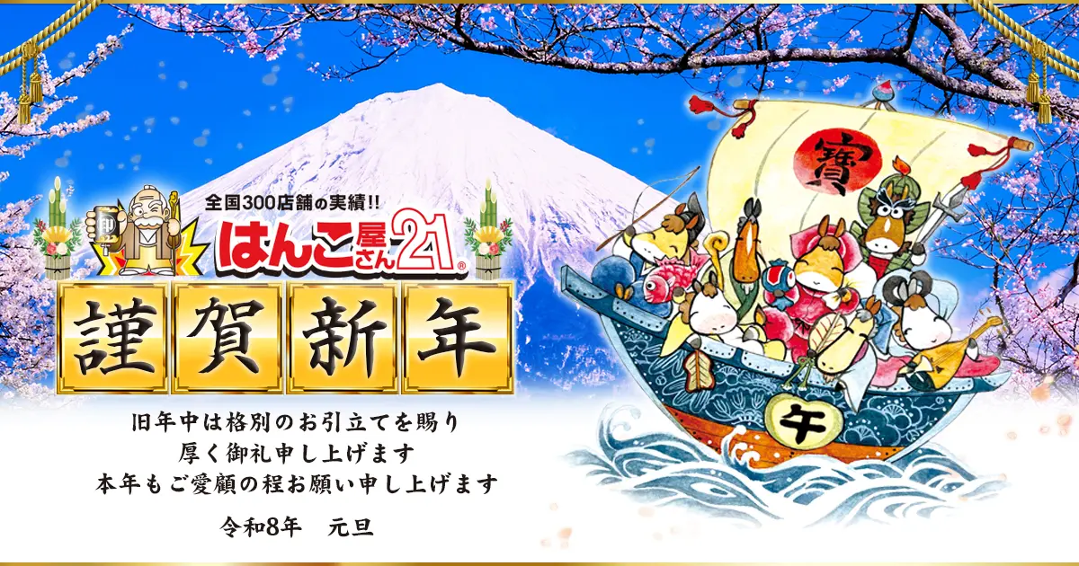 新年あけましておめでとうございます 2026.01.01 謹んで新年のお慶びを申し上げます 旧年中は格別のお引立てを賜り、厚く御礼申し上げます 本年もサービス向上に努め 皆様のご期待にお応えできるよう励んでまいります 変わらぬご愛顧を賜りますようお願い申し上げます 令和八年 元旦 はんこ屋さん21