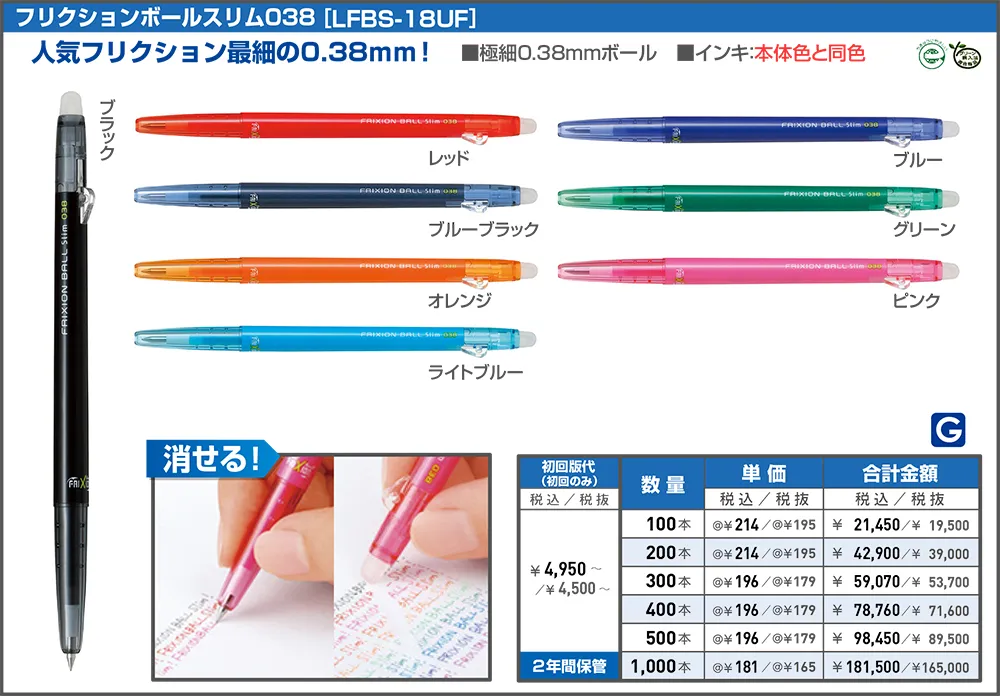フリクションシリーズで最も細書きのボール径0.38mmの消えるボールペン。教科書などへの細かな文字の書き込みに適した超極細タイプ。ボディも細身でかさばらないから、ペンケースなどにもたくさん入ります。