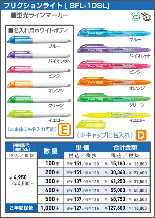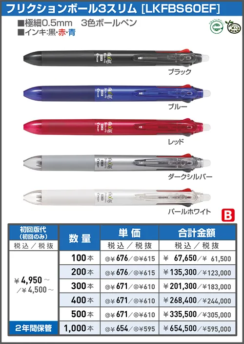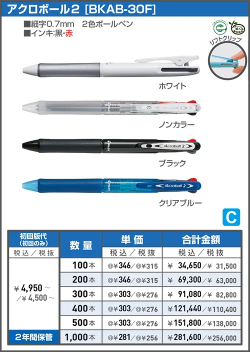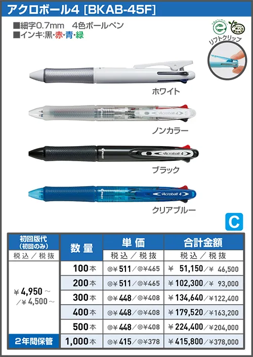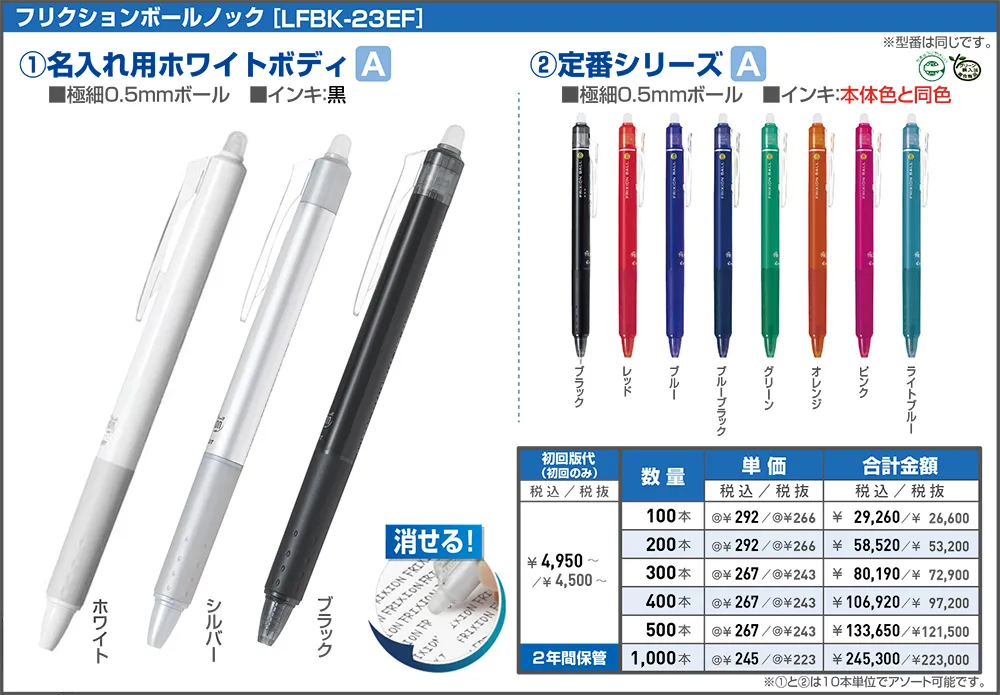消せるボールペン「フリクションシリーズ」や書きやすい「アクロボール」など使いやすいボールペンなどに名入れ印刷をしてオリジナルノベルティが制作できます。