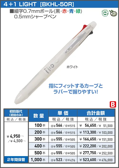 ボールペン4色(黒・赤・青・緑)とシャープペンシルを搭載した多機能筆記具。