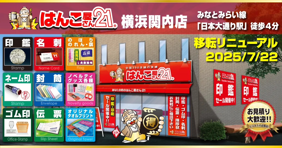 2025年7月22日 はんこ屋さん21横浜関内店は、店舗を移転し新店舗にてオープンいたしました。
